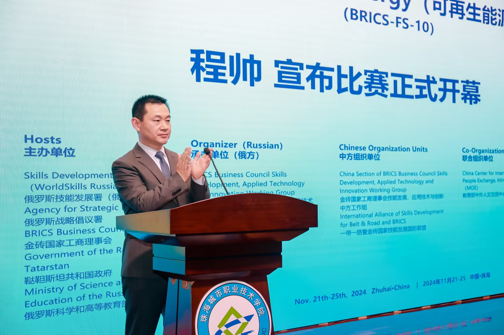 金砖国家职业技能大赛中方竞赛办公室三处处长程帅启动开幕仪式,宣布2024金砖国家职业技能大赛可再生能源赛项国际总决赛正式开幕!