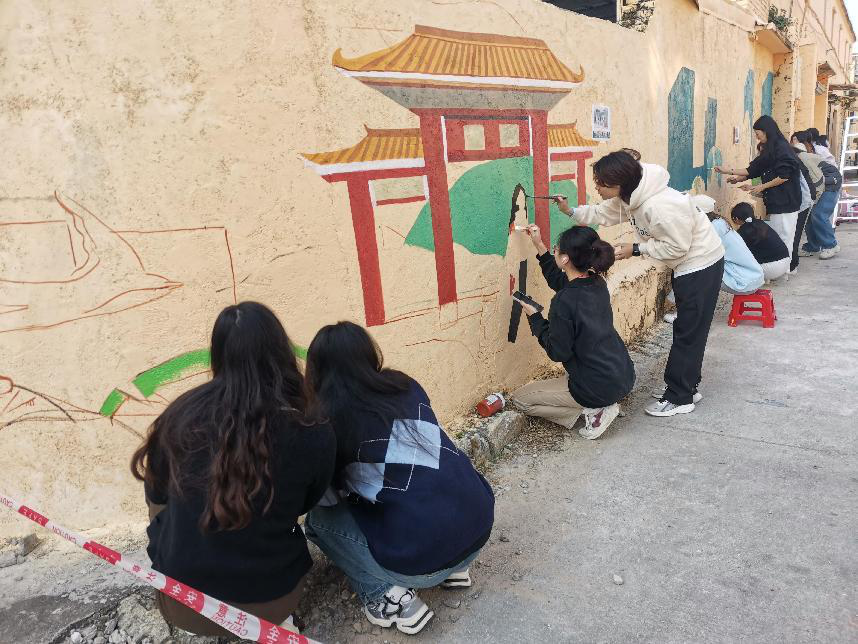(人文学院 美育中心)近日,为进一步推动“百千万工程”深入实施,加快美丽乡村建设,人文学院、美育中心美术老师、学前教育专业学生共30余人赴斗门区马山村开展了别开生面的美丽乡村墙体绘画活动。师生们在马山村牌坊街头分工合作,协力配合,用手中的画笔和调色盘,将马山村的人文历史、自然美景及新时代的发展成果通过墙绘艺术的方式生动呈现。这些墙绘不仅为乡村旧墙披上了新装,更将艺术有机融入乡村文化,成为传递文明新风、凝聚村民共识的重要载体。