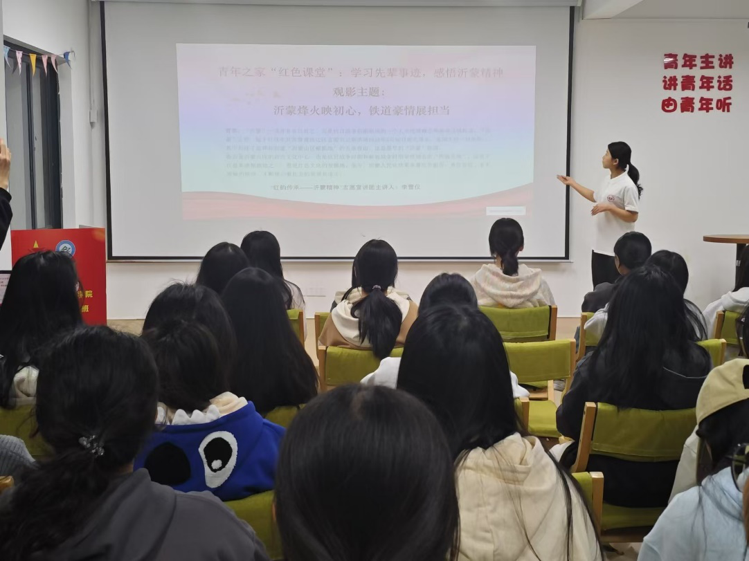 在活动中,宣讲团成员李雪仪同学以“微宣讲+观影”的形式开展宣讲。她讲述了影片《铁道游击队》抗日战争时期鲁南铁道大队在党的领导下与日寇展开英勇斗争的故事。微宣讲结束后,同学们一起观看了影片《铁道游击队》,深刻体会沂蒙精神。