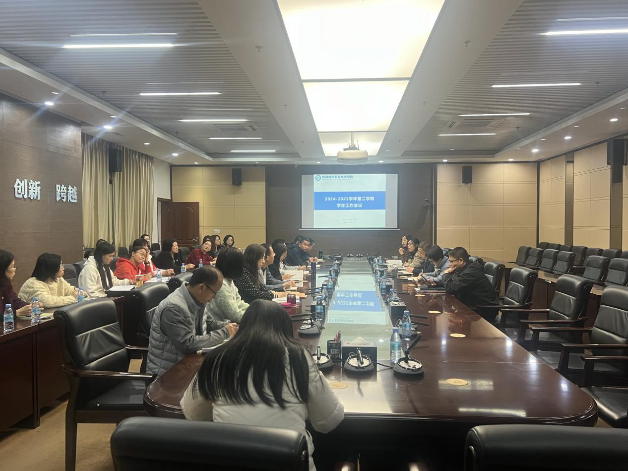 (学生工作部 报道)3月6日下午,学校组织召开新学期学生工作会议,学校党委委员、宣传部部长周剑平,各二级学院党总支副书记、学工组长、全体辅导员,学生工作部以及校团委全体老师参加了会议。