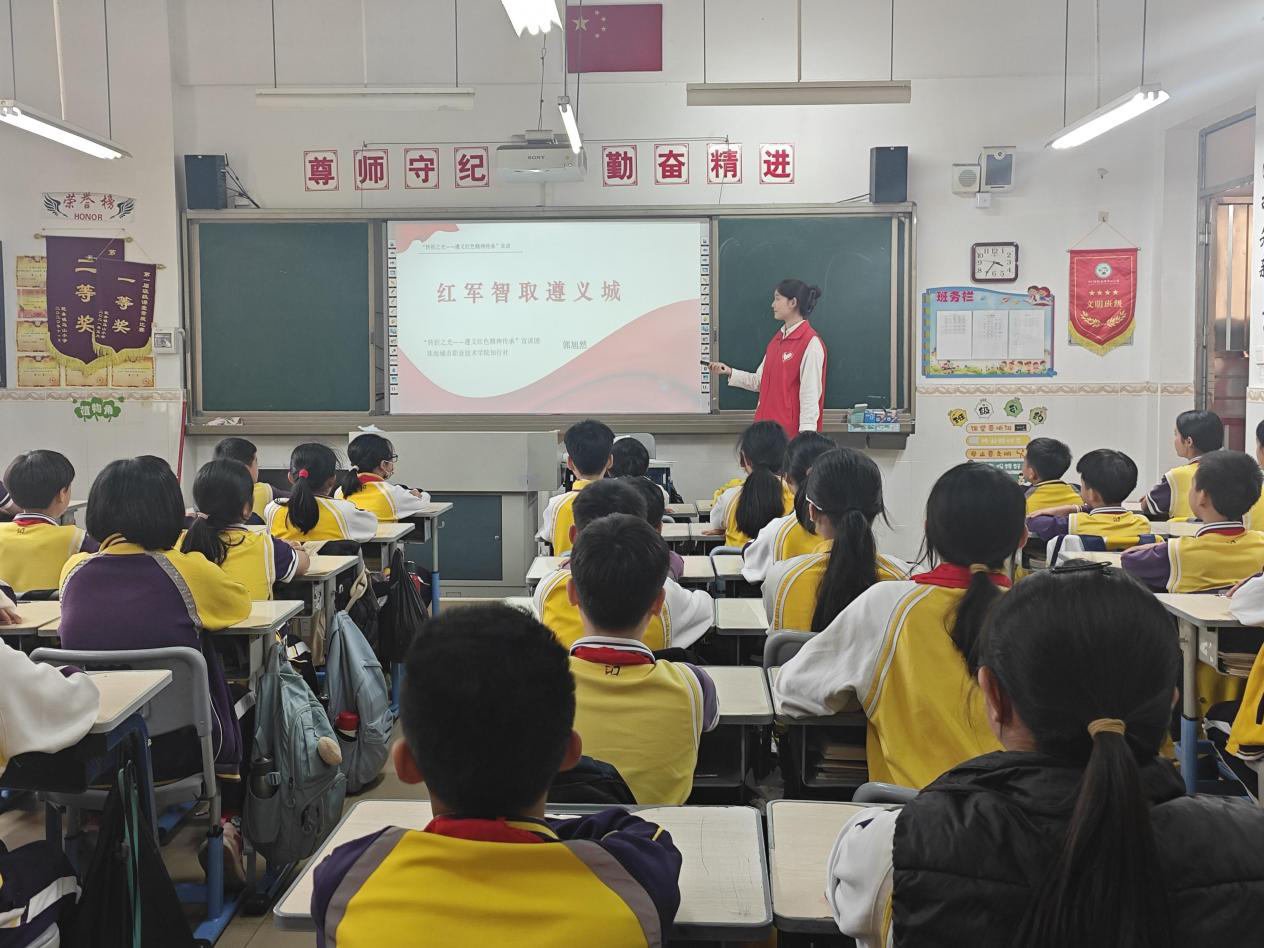 第二场宣讲中,宣讲员郭旭然生动演绎了红军智取遵义城的惊险历程。她用通俗易懂的语言,讲述了红军战士们如何凭借着坚定的信念、过人的智慧和无畏的勇气,突破重重难关,成功占领遵义城,为中国革命的伟大转折奠定了坚实基础的故事。小学生们被革命先辈的英勇事迹深深吸引。