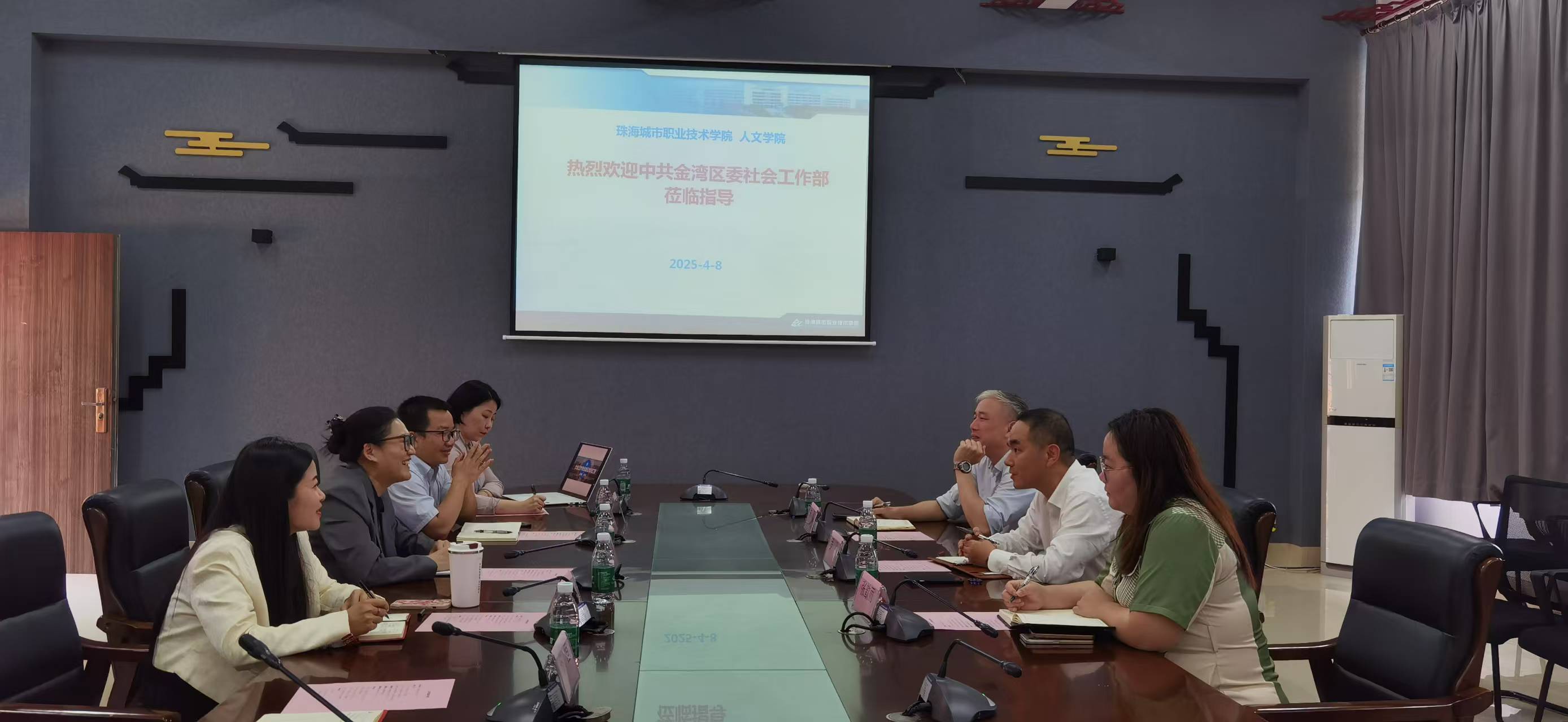 (人文学院 报道)4月8日下午,中共金湾区委社会工作部部长罗刚、副部长朱颖一行来我校人文学院考察交流。双方在博雅楼会议室交流座谈,人文学院党总支书记李妮、副院长何永根及社工专业教师参加了此次座谈会议。双方就社会工作人才培养及行业发展等关键问题进行了深入交流。
