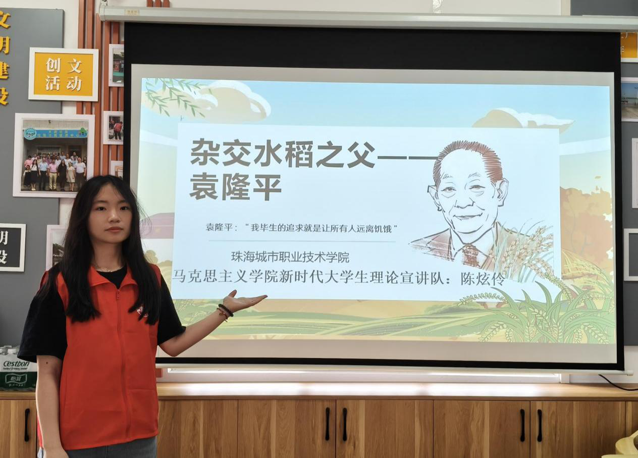 (马克思主义学院 报道)5月10日下午,马克思主义学院知行社在珠海市金湾区平沙镇大虎社区新时代文明实践站,成功举办“红韵之声,薪火相传”红色故事宣讲系列活动。本次活动以“杂交水稻之父——袁隆平的逐梦人生”为主题,通过沉浸式宣讲与趣味互动,带领社区居民尤其是青少年群体,感悟科学家精神的时代价值。