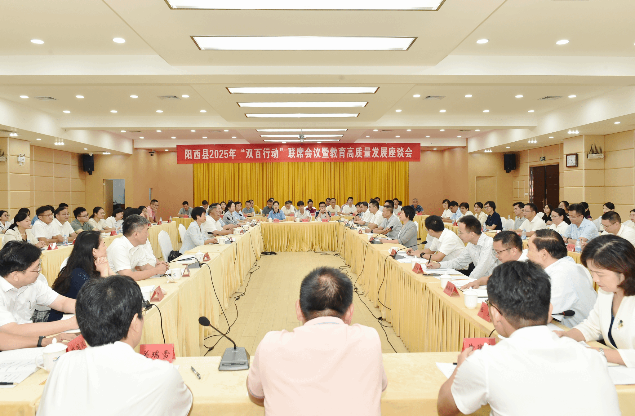 (党政办公室 报道)7月17日,我校党委副书记、校长陈斗雪带队出席阳西县2025年“双百行动”联席会议暨教育高质量发展座谈会,此次会议在阳西县人民政府召开,由阳西县委副书记、县长黄家新主持。出席会议的还有阳西县政府、广东第二师范学院、珠海市教育局、珠海市第一中学、阳江市教育局等结对单位有关领导及我校相关部门负责人。