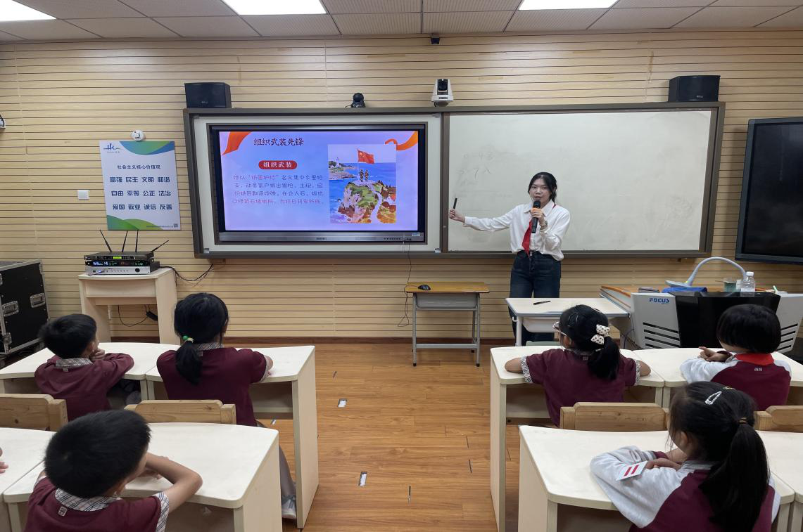 此次宣讲活动共设立两个红色小课堂,由知行社宣讲队陈奕暖同学、林曦婷同学和马盛洁同学负责。她们通过“理论宣讲+故事分享+互动实践”的形式,为金钟小学的同学们带来了一节丰富有趣、别开生面的红色宣讲课。在课堂上,她们满怀激情,深情讲述了宋振中、郑汝森两位革命烈士的英雄事迹。为突破传统单向宣讲模式,她们精心设计知识问答、诗歌朗诵、趣味游戏等互动环节,激发学生参与热情,从“被动听讲”转向“主动体验”,在沉浸式学习中让革命形象更鲜活、红色记忆更深刻。