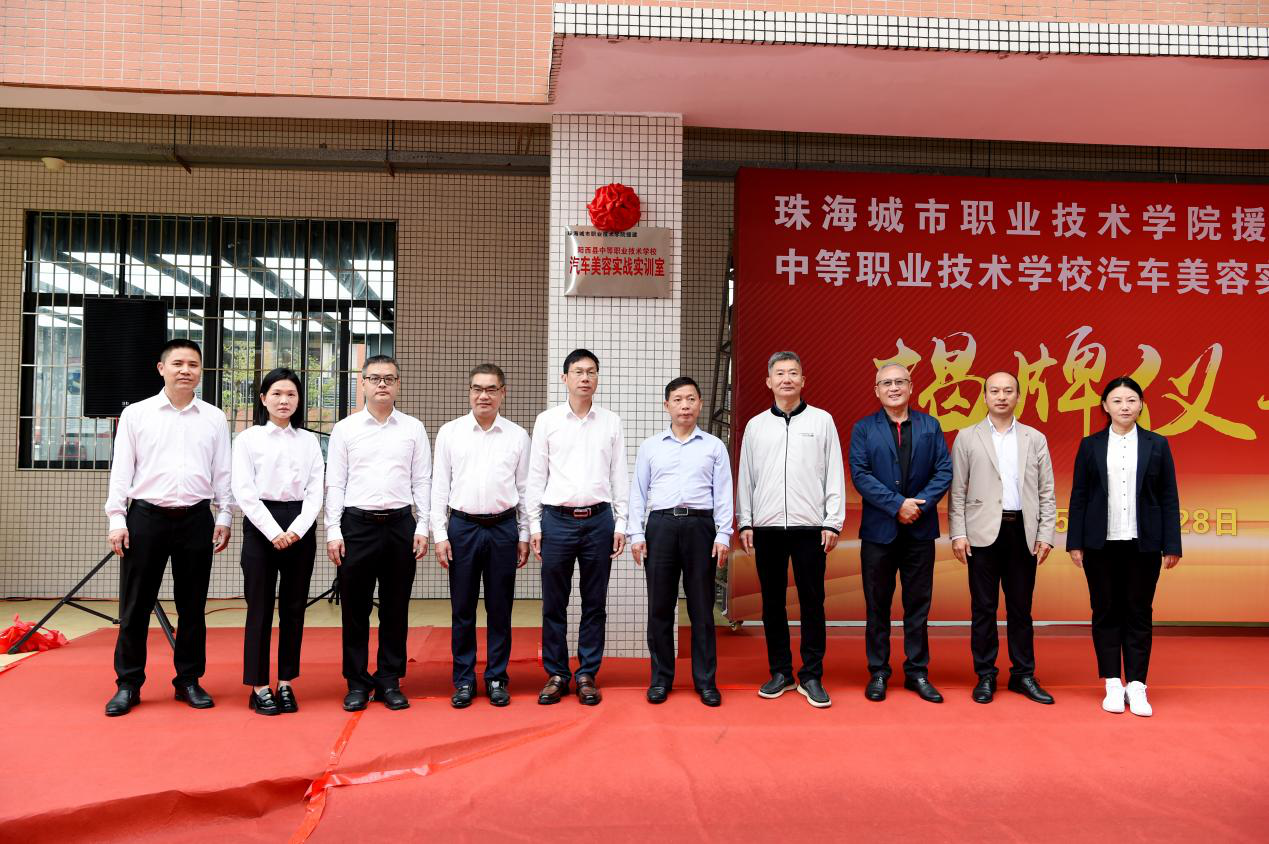 (党政办公室 报道)10月28日,由我校援建的阳西县中等职业技术学校汽车美容实战实训室正式揭牌并投入使用。我校党委副书记唐顺铁,阳西县副县长黄义科,县府办、县教育局系统相关负责同志以及阳西县中等职业技术学校师生代表参加了此次揭牌仪式。揭牌仪式由阳西县教育局党组书记、局长陈仲欣主持。
