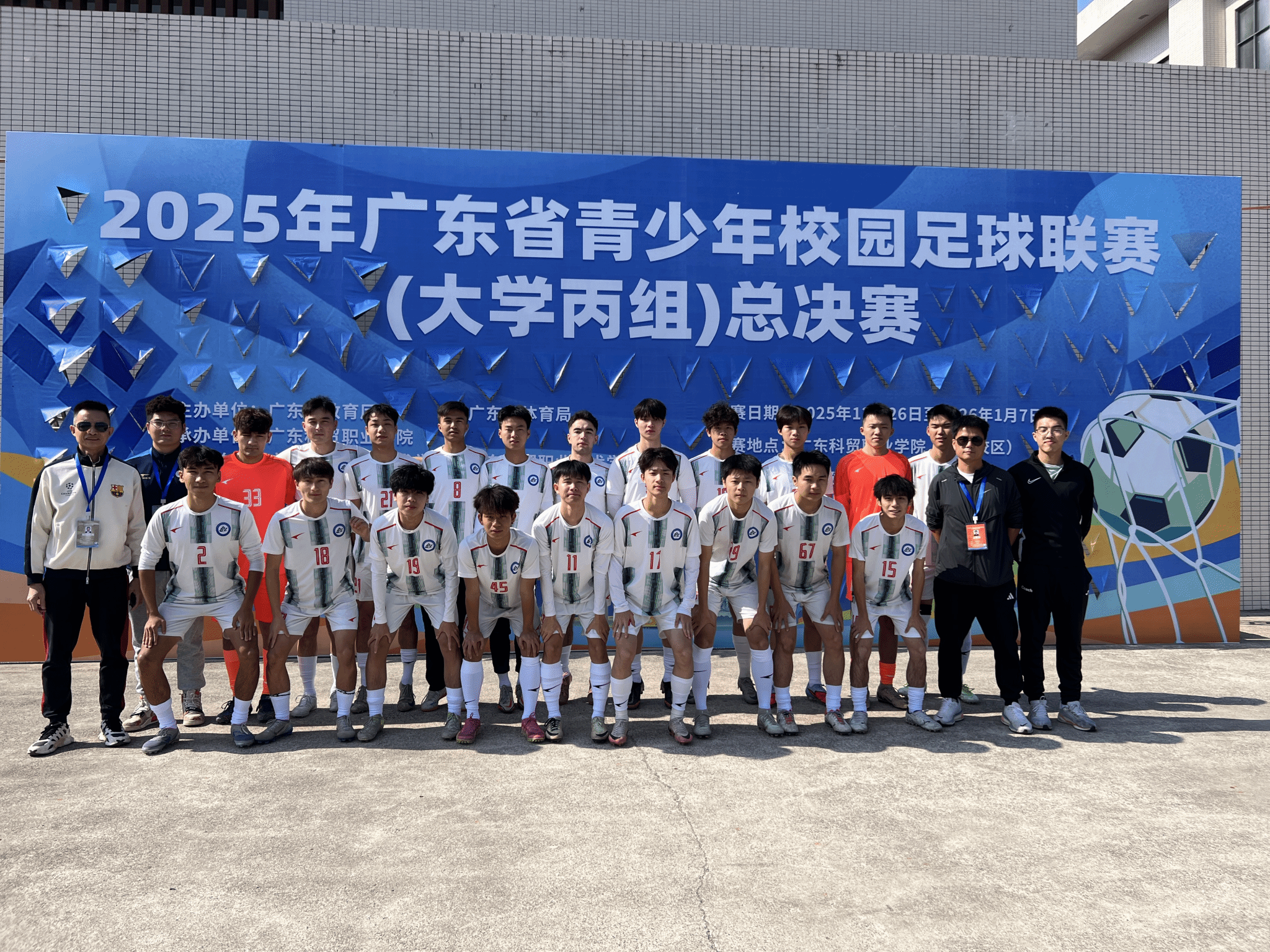 2025年12月26至2026年1月7日,由广东省教育厅主办,广东省体育局、广东科贸职业技术学院承办的2025年广东省青少年校园足球联赛(大学丙组)总决赛在广东省清远市广东科贸职业技术学院开赛。经过激烈角逐,我校男子足球队获得(丙B)一等奖第四名的好成绩,取得晋级丙A组资格。蔡志廉、周德武、赵迅三位老师同时获本次比赛优秀教练员称号。这是继2023年获得该赛事第三名后又一次打进四强的好成绩。