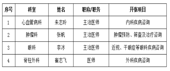 提供一对一医疗咨询,包括内科、外科、眼科、口腔科、皮肤科疾病(包括美容、皮肤病、性病 )咨询,肿瘤预防、筛查及治疗咨询,测血压等。