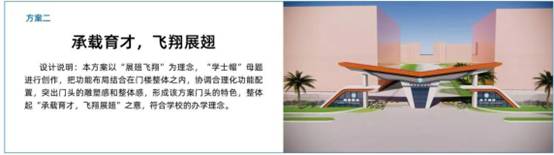 学校大门不仅是学校与外界联系的交通要道和门户,也是学校的重要标志之一,反映着学校的形象和精神风貌。为更好地设计西校区南大门,我校委托珠海市规划设计研究院设计了两套方案,分别是方案一“传承精神,扬帆起航”;方案二“承载育才,飞翔展翅”。