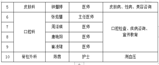 提供一对一医疗咨询,包括内科、外科、眼科、口腔科、皮肤科疾病(包括美容、皮肤病、性病 )咨询,肿瘤预防、筛查及治疗咨询,测血压等。