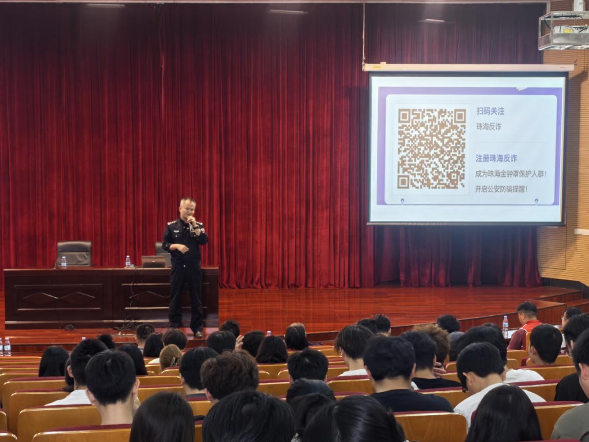 (后勤保卫处报道)2025年3月26日下午,我校举办2025年春季学期校园防诈宣传培训讲座,旨在增强我校师生的防诈骗意识,有效遏制校园诈骗案件的发生。金湾区公安分局金海滩派出所、三灶镇平安法治办、西湖社区等部门负责人,学校党委委员、副校长刘向阳,党委委员、宣传部长周剑平及党委学工部、后勤保卫处、各二级学院辅导员、班主任及学生代表近200人参加。