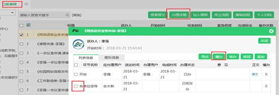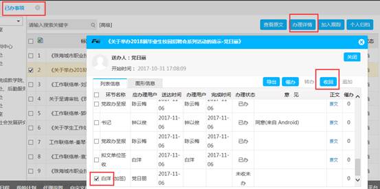 1)、进入本人的已办事项列表里找到想要收回的流程,选择这个流程的办理详情,在办理详情界面选择要收回的环节,点击收回按钮收完成收回操作。