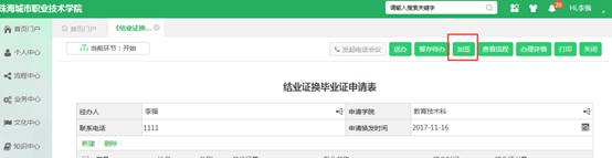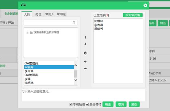 选择加签对象(可以多选),可以输入加签的意见,可以勾选以手机短信通知被加签人,如果勾选“是否等待”,表示等待多个加签对象处理完后才能进入到下一个审批环节。