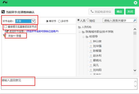 2) 选择“重新提交后直接返回本节点”,如没有选择,退回后重新在退回到的环节开始往下走。