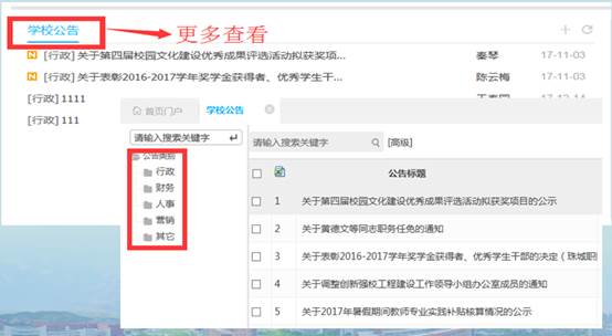 2、公告查看—分类方法,点击“学校公告”四个字弹出如下所示: