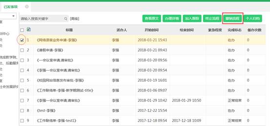 2) 在已发事项列表里选择要撤销的流程,点击撤销按钮,操作如下图所示: