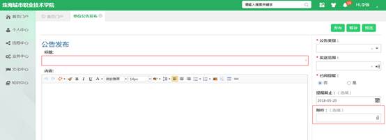 单击“学校公告”后的“+”按钮弹出如下图所示的发布界面。