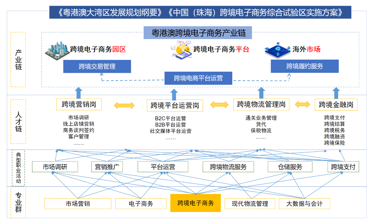 专业群内 5 个专业同属财经商贸大类,在基础性知识技能方面高度一致,这为制定统一的专业群课程体系和课程标准奠定了坚实基础,有力推动了专业群资源的共享与共融;同时,这些专业对接的岗位业务均处于现代商贸服务业产业链的上下游,专业间组团发展能够产生 1+1>2 的协同效应。经济管理学院依托此专业群,面向粤港澳大湾区和横琴粤澳深合区的跨境电商产业发展需求,全力培养思想政治坚定、德智体美劳全面发展,熟练掌握市场调研、营销推广、跨电平台运营、跨境物流服务、仓储服务、跨境支付结算等技能,能够胜任跨境电商平台运营、跨境交易管理、跨境履约服务等跨境商贸岗位的高素质复合型技术技能人才,为区域经济发展注入源源不断的专业力量。