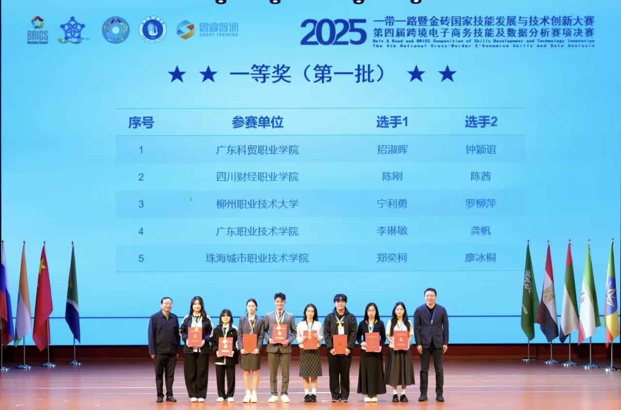 (经济管理学院 报道)11月5-6日,在2025“一带一路”暨金砖国家技能发展与技术创新大赛——第四届跨境电子商务技能与数据分析赛项全国总决赛中,我校经济管理学院跨境电商专业3支学生团队(廖冰桐、郑亦柯;谢愉玲、谢美诗;蓝金鸿、郑润毅)表现优异,从全国百余支高职队伍中脱颖而出,分获全国一等奖、二等奖和三等奖。指导教师封晔、高倩倩、张静、张思敏获评“优秀指导教师”,学校荣获“最佳组织奖”。