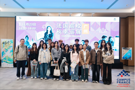 11月23日,我院法国克莱蒙高等商学院2+2学分互认项目班(以下简称中法项目班)师生20人前往广州越秀国际会议中心参加“2025法国高校秋季巡展 - 广州站”留学交流活动。
