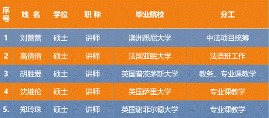 中法2+2学分互认本科培养项目班建了一支学历层次高、国际化背景突出、教学特色鲜明的师资队伍,为项目高质量运行与人才培养提供坚实保障。师资队伍由5位拥有海外留学背景的高学历专任教师组成,全员具备扎实的专业理论功底与丰富的教学实践经验。
