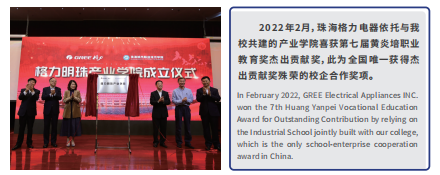 ZHCPT integrates high-quality resources and actively promotes in-depth school-enterprise cooperation with regional leading enterprises with the strength of the whole college. In November 2018, ZHCPT and GREE Electrical Appliances INC. co-founded GREE Pearl Industrial School, which has integrated high-quality resources and actively promoted in-depth school-enterprise cooperation with regional leading enterprises. We give full play to the advantages of educational and technical resources of both sides, and precisely cultivate technical talents who will meet the development plan of GREE Electrical Appliances INC. and their needs of talents. In February 2022, GREE Electrical Appliances INC. won the 7th Huang Yanpei Vocational Education Award for Outstanding Contribution by relying on the Industrial School jointly built with our college, which is the only school-enterprise cooperation award in China.
