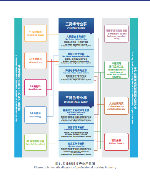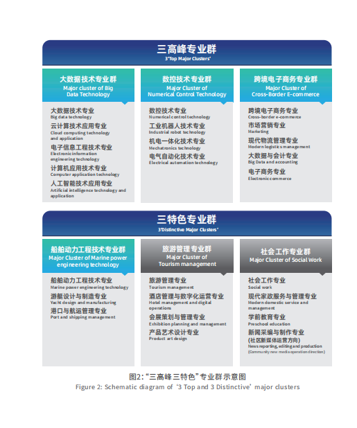 In order to serve the Guangdong-HongKong-Macau Greater Bay Area, especially the economic and social development of Zhuhai, ZHCPT precisely aligns with the industrial development goals of Zhuhai during the 14th Five-Year Plan period, optimizes the discipline layout and major setup. The matching degree between majors and regional key industries is 100%. Focusing on the development of engineering, the resources are also tilted towards engineering majors.We focus on developing three ‘Top Major Clusters’ of Big Data Technology, Numerical Control Technology and Cross-Border E-commerce, and drive the coordinated development of three `Distinctive Major Clusters’, including the majors of Marine Power Engineering Technology, Tourism Management and Social Work, to form a‘3 Top, 3 Distinctive’ major clusters. The four major clusters of Numerical Control Technology, Big Data Technology, Ship Power Engineering Technology, Cross-Border E-commerce, have entered the construction sequence of high-level major clusters in higher vocational colleges in Guangdong Province.