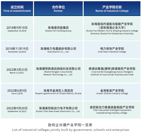 Focusing on the needs of economic and social development in Jinwan District, ZHCPT signed a strategic cooperation framework agreement with the Jinwan District Government. In June 2022, the college launched the ‘Jinwan Institute of Smart Manufacturing Industry’, giving full play to our strength of talent training and major setup, deepening the cooperation with governments, college and enterprise, directly serving the actual needs of industrial development, and better promoting local economic and social development. In May 2023, ZHCPT, Jinwan District Government and Guangdong Institute of Science and Technology jointly built Jinwan University Science Park, giving full play to the advantages of school-enterprise cooperation, and closely combining with the college talent training and the development of the majors, to achieve the comprehensive docking of the park, enterprises and talent, innovative resources, and then strive to build a‘Government, Industry, Learning, Research and Use’ integrated innovation platform for the development of regional industrial economy to make due contribution.