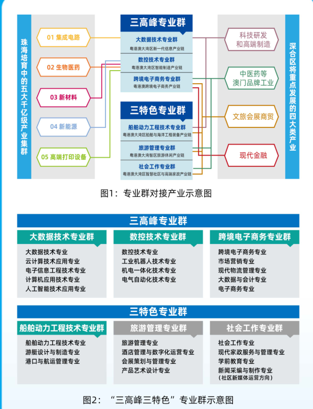 为服务粤港澳大湾区特别是珠海经济社会发展,学校精准对接珠海“十四五”时期的产业发展目标,优化专业布局,专业设置与区域重点产业匹配度为100%,重点发展工科,学校资源也重点向工科专业倾斜。重点建设大数据技术、数控技术、跨境电子商务3大高峰专业群,并带动船舶动力工程技术、旅游管理、社会工作3大特色专业群协同发展,形成“3高峰3特色”专业群。其中数控技术、大数据技术、船舶动力工程技术、跨境电子商务4个专业群已进入广东省高职院校高水平专业群建设序列。