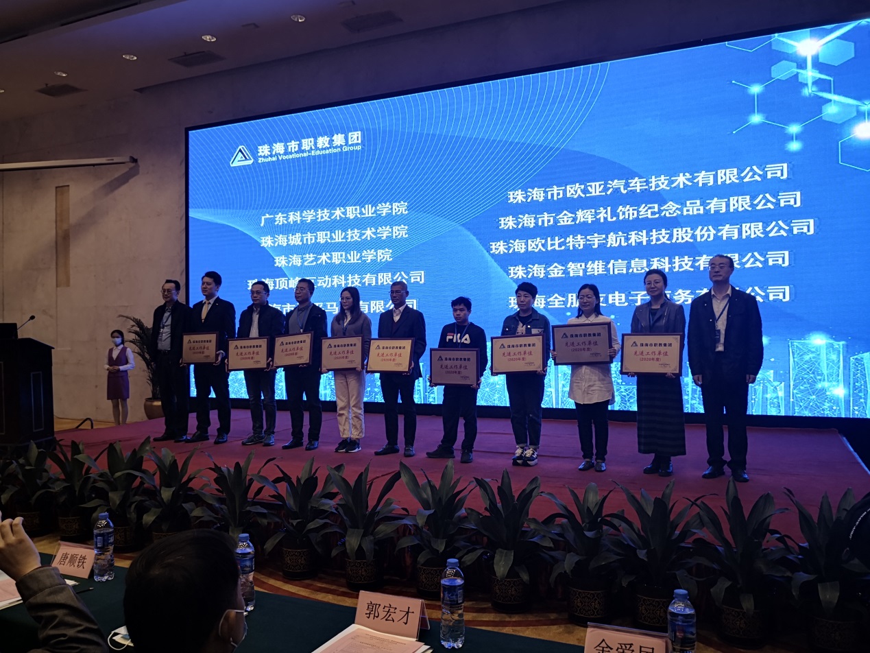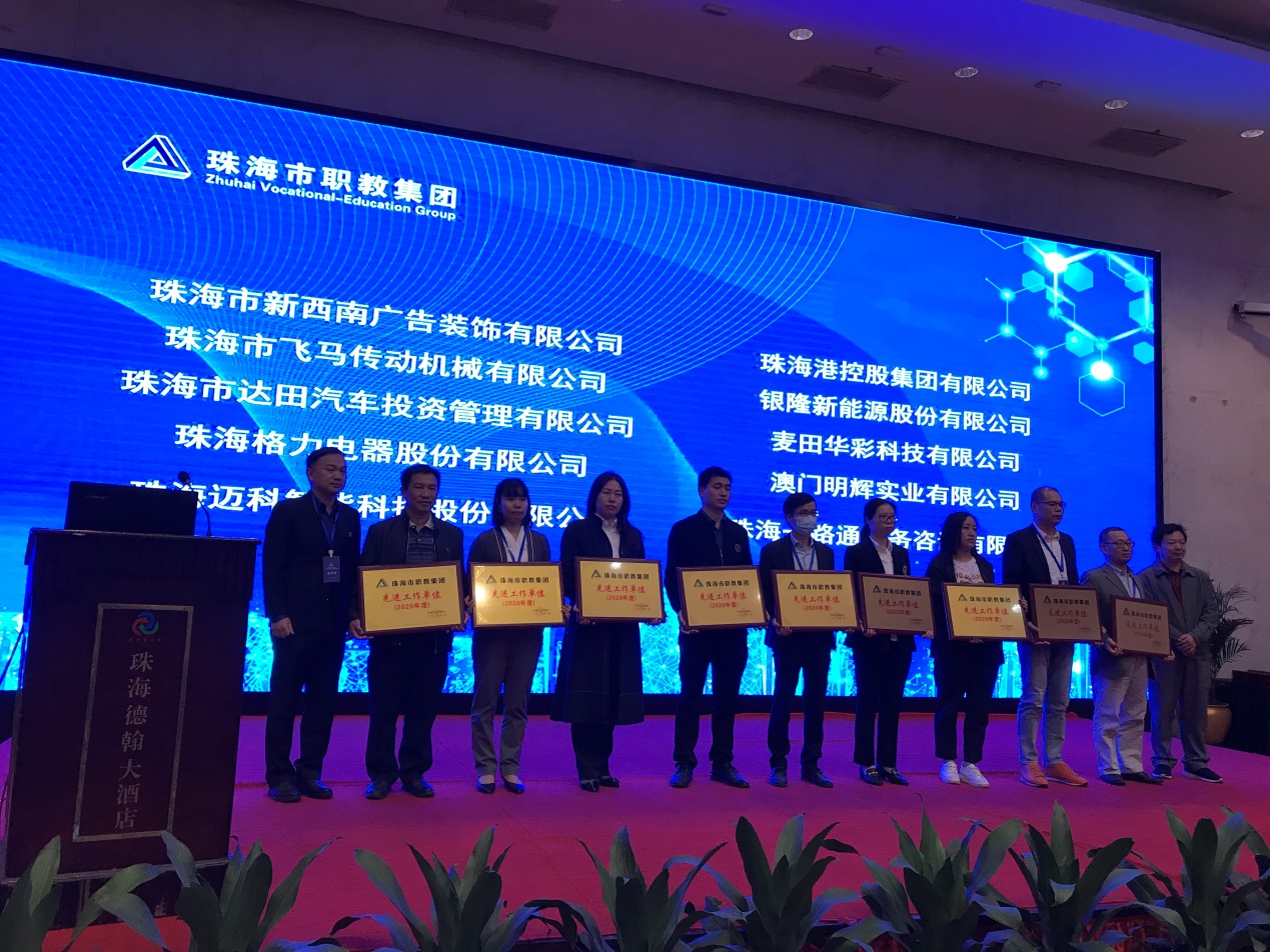 随后,大会表彰了2020年度集团先进工作单位和先进个人,我校获评2020年度珠海市职教集团先进工作单位。我校合作企业珠海格力电器股份有限公司、珠海港控股集团有限公司、珠海迈科智能科技股份有限公司、珠海达田汽车投资管理有限公司、银隆新能源股份有限公司同获此殊荣。机电工程学院唐春华等10人被评选为2020年度先进个人。经济管理学院党总支书记刘敏就我校与珠海港控股集团有限公司合作共建企业大学项目,向与会嘉宾作题为“校港协同 实践育人”经验分享。