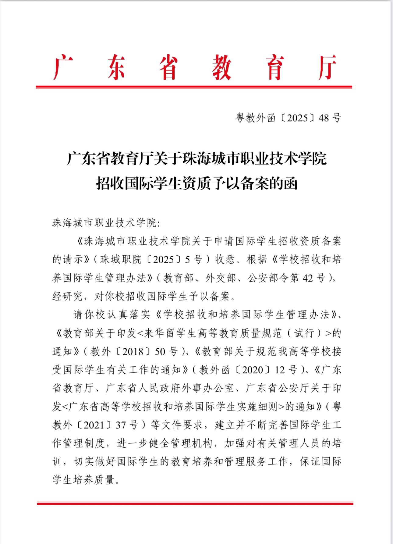 (校企合作处 报道)8月12日,广东省教育厅正式发文(粤教外函〔2025〕48号),对我校招收国际学生的资质予以备案,这标志着我校已具备招收和培养国际学生的正式资格,国际化办学迈出关键新一步。
