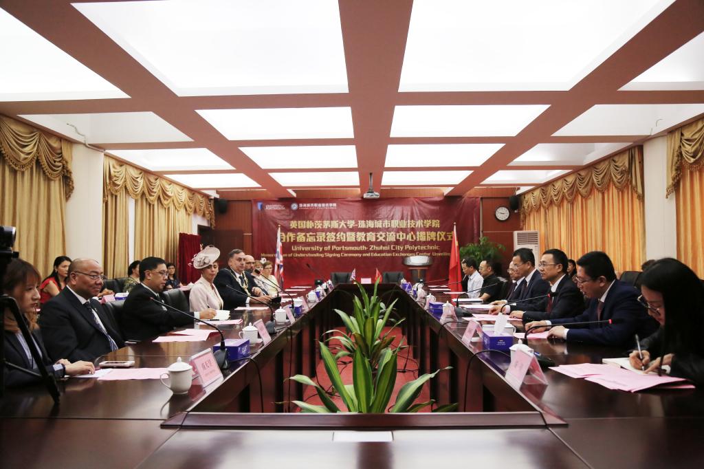 (交流合作处 报道)10月28日下午,朴茨茅斯大学-珠海城市职业技术学院合作备忘录签约暨教育交流中心揭牌仪式在珠海开放大学隆重举行。英国朴茨茅斯市市长大卫·富勒,珠海市副市长阎武,市委外事工作委员会办公室主任张梅生,教育局调研员朱辉,我校党委副书记唐顺铁,副校长吴凡、刘向阳出席了揭牌仪式及签约活动。