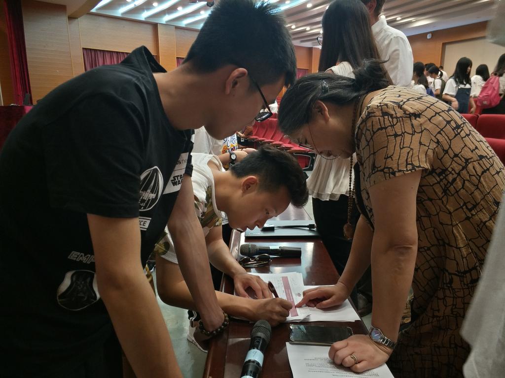 随后,朗阁教育的Allan老师和Judy老师则为同学们解答了关于语言学习方面的疑惑,模拟展现了一堂别出心裁的英语课,大大增强了大家学习英语的信心和动力。不少同学在提问互动环节积极发言,在场的老师们耐心向新生传达了美好的祝愿并给予指点,宣讲会在愉悦的交谈中结束。会后,几位有意该项目的同学在现场登记报名,并与Pate先生和相关教师就留学具体事宜进行了交流。