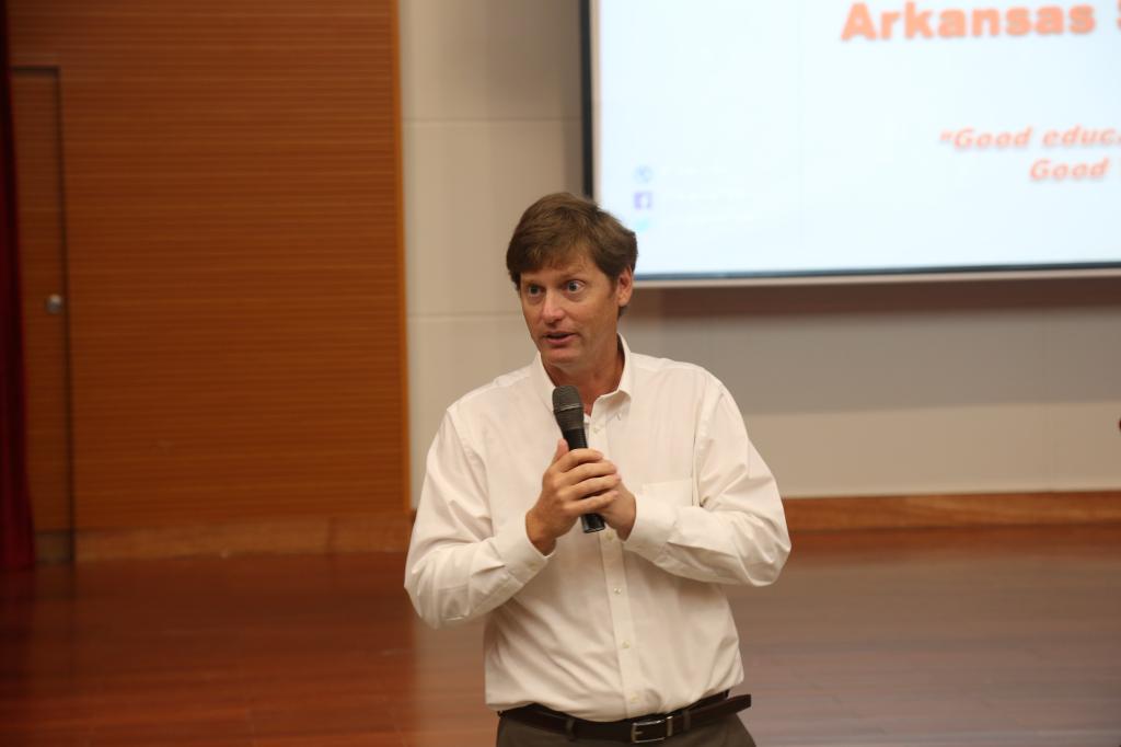 来自美国阿肯色州立大学的John Pate先生掀起了宣讲会的高潮,他首先诚挚欢迎我校学子前往阿肯色求学,并向同学们介绍了阿肯色州立大学的特色专业与项目培养计划。对于同学们所关心的留学所需条件、两校的学分互换、食宿、文化活动等细节,Pate先生给出了详尽的解释。他那生动诙谐的中文,热情洋溢的讲演感染并震撼着每位到场的学子,现场笑声与掌声此起彼伏。