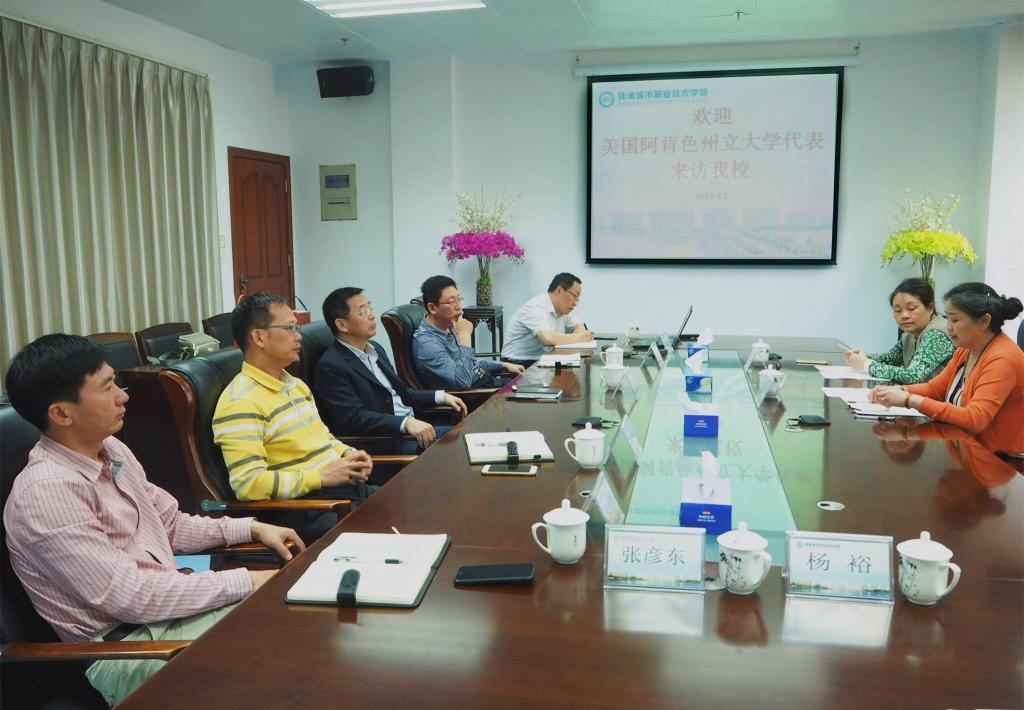 (交流合作处 报道)我校与美国阿肯色州立大学开展的2.5+2大数据专业人才联合培养项目,已于今年3月24日完成自主招生考试,报考人数高达240人。为确保项目顺利实施,美国阿肯色州立大学代表余玉辉女士一行2人于4月3日到访我校,与我校领导和各相关部门负责人共同探讨未来工作计划。刘华强校长、刘向阳副校长,交流合作处处长梁伟东,学生工作处处长崔国汉,教学科研处教务科科长徐波,电子学院院长马维旻、大数据专业负责人杨裕老师出席了会议。