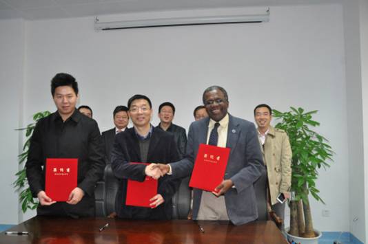 (交流合作处 报道)2016年3月15日上午,美国加州旧金山佩尔拉塔大学校长拉盖尔、董事郑汉星先生一行,美国教育发展基金会董事吴栋、董事吴斯珂、中国代表处丁剑先生一行,名仕国际教育总经理刘涛等一行到访我校。我校刘华强校长,刘向阳副校长,交流合作处陈华处长等在行政中心1107与他们进行洽谈。三方就有关合作办学事宜进行协商并签订合作备忘录。