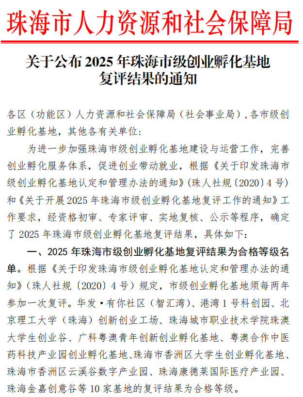 (创新创业教育中心 报道)近日,珠海市人力资源和社会保障局公布2025年珠海市级创业孵化基地复评结果,我校市级创业孵化基地——珠澳大学生创业谷复评结果为优秀。本次参评单位共有10家,其中4家获得优秀。