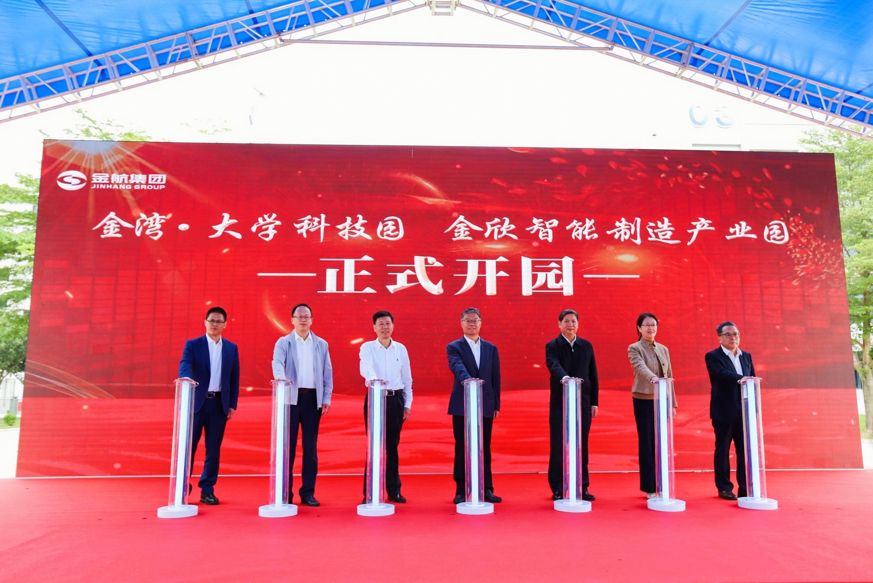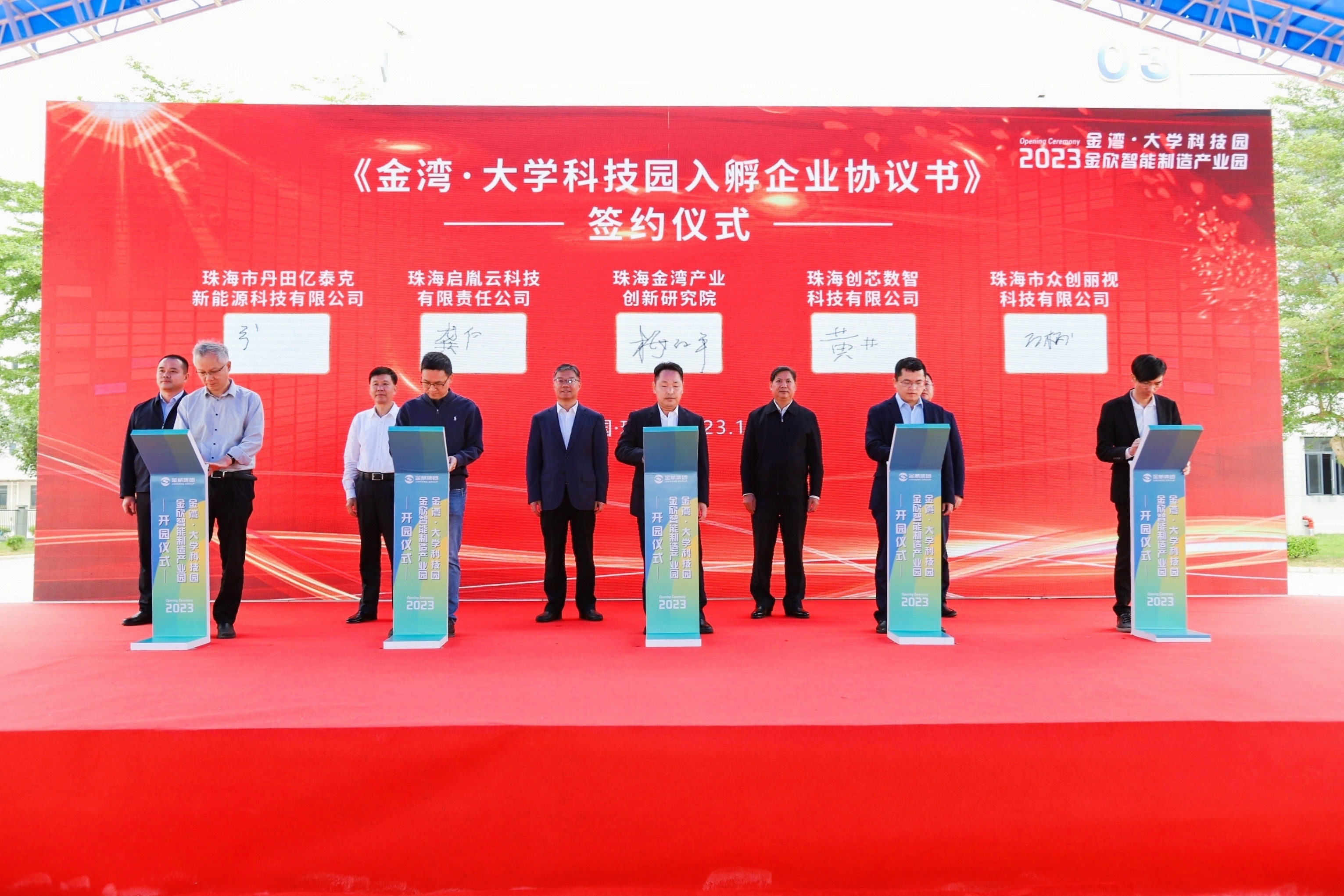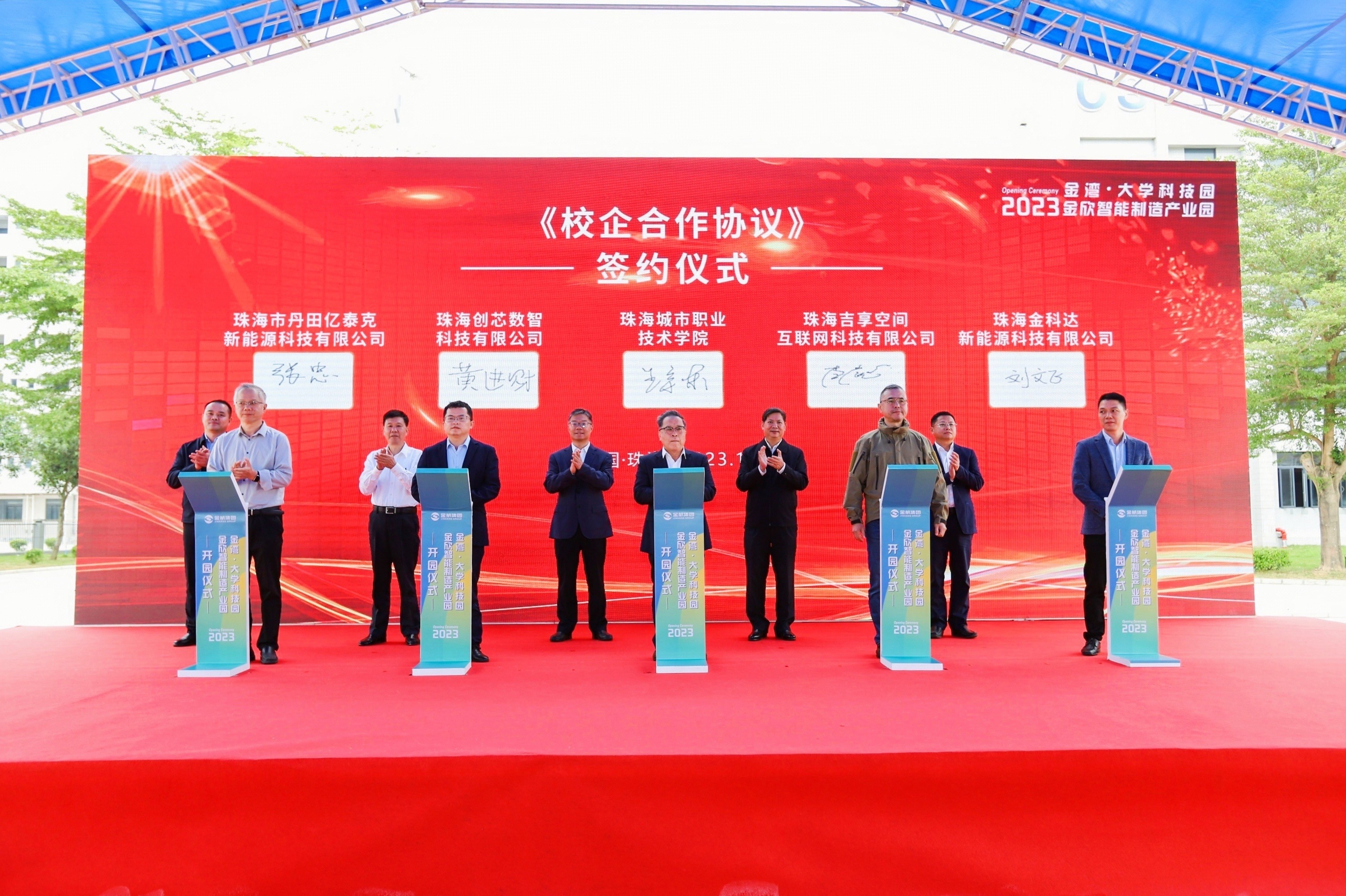 (校企合作处 报道)11月14日上午,金湾·大学科技园、金欣智能制造产业园正式开园。开园仪式上,珠海金湾产业创新研究院院长梅伯平代表金湾·大学科技园与珠海创芯数智科技有限公司等8家企业现场签约。王宇东副校长代表我校与珠海市丹田亿泰克新能源科技有限公司等8家企业签订《校企合作协议》。金湾区委书记、珠海经济开发区党工委书记梁耀斌,广东科学技术职业学院党委书记黄仕初,广东科学技术职业学院党委副书记、校长张力,我校党委书记钟以俊等领导出席开园仪式并见证签约。