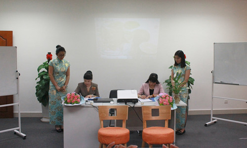 接着是第二批导师就职拜师仪式。新教师朱虹和罗菁菁采用新颖的献茶方式,敬拜张雄志、霍巧红为师,表达尊师重道之意。在全体教师的见证下,两位新教师与两位导师郑重地签署了《新教师导师制协议书》。