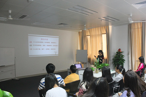 本次培训由两位准备充分的“学生小导师”进行讲解。来自14旅游1班的张晓韵小导师以一名“导游”的身份为同学们介绍了办公室的分布以及美化工作的任务和标准;14酒管1班的叶晓莎小导师为同学们详细介绍了办公室各种植物的习性和护理注意事项。