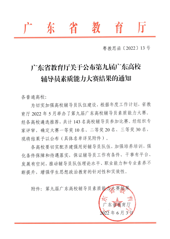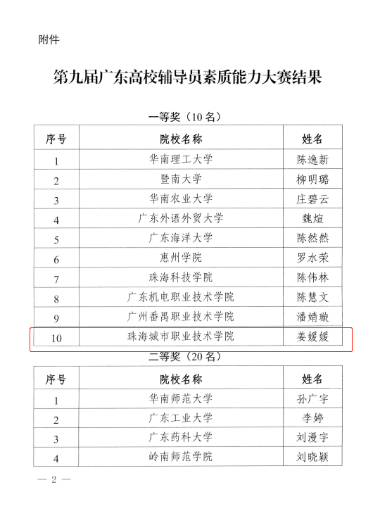 5月16日至5月22日,由广东省教育厅主办,高校思想政治工作队伍培训研修中心(华南师范大学)、珠海科技学院共同承办的第九届广东高校辅导员素质能力大赛近日落下帷幕,本次大赛共有来自全省143所高校的143名选手参赛。我校选派的辅导员姜媛媛老师在本次大赛中斩获一等奖,是我校有史以来取得的最好的成绩!也是我校学生工作知行合一、理论与实际相结合的一次成果检验。
