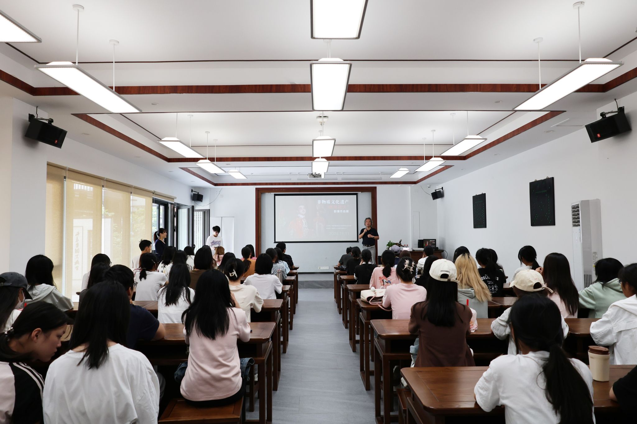 (美育中心 报道)为提升学生艺术审美和人文素养,2024年11月11日下午15:45,由我校与珠海市摄影家协会共同举办的“非物质文化遗产——‘陇州社火’影像作品展”开幕式在博雅楼架空层展厅拉开帷幕,学校党委副书记、校长陈斗雪,党委副书记、纪委书记曾建平,党委委员、宣传部长周剑平出席,著名摄影家吴晓鹏,珠海美协副主席林洋,兄弟院校代表,全校师生代表200余人汇聚于此,共同观展。开幕式前,摄影家吴晓鹏在中华优秀传统文化教学实践基地(四于书院)开展了一个多小时的摄影讲座。