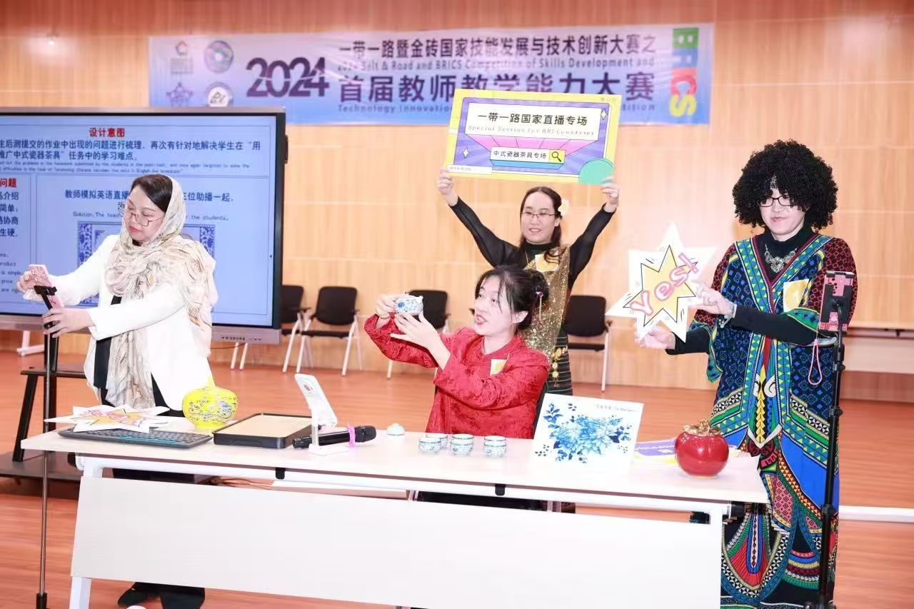 外语教学部教学团队在2024—带一路暨金砖国家技能发展与技术创新大赛-首届教师教学能力大赛总决赛(公共课组)中进行教学绝活比拼