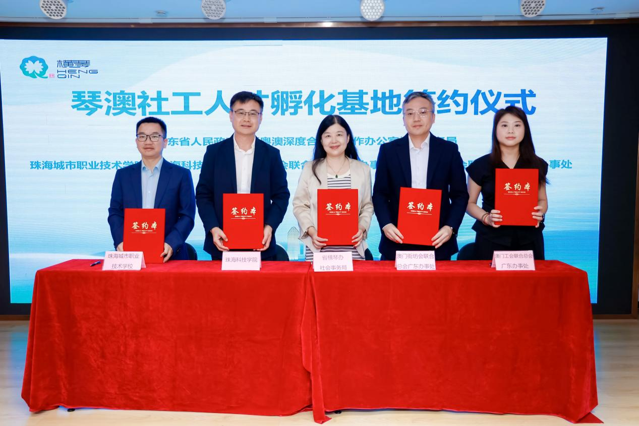 (人文学院 报道)2025年10 月 17 日,第二批 “琴澳社工人才孵化基地” 在澳门街坊会联合总会广东办事处横琴综合服务中心揭牌成立。省横琴办社会事务局与我校签署《产学研合作备忘录》,仪式上,省横琴办社会事务局与我校签署《产学研合作备忘录》。我校校企合作处处长陈劲策、人文学院副院长何永根、社会工作专业主任何可倩出席签约仪式。