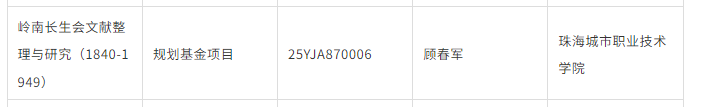 (人文学院 报道)2025年10月,教育部人文社会科学研究规划基金项目立项名单正式公布,人文学院教师党支部党员顾春军教授申报的 “岭南长生会文献整理与研究(1840—1949)” 项目成功获批。这是顾春军教授继 2022 年 “香山碑刻文献整理与研究” 项目后,再次斩获该国家级科研项目立项。
