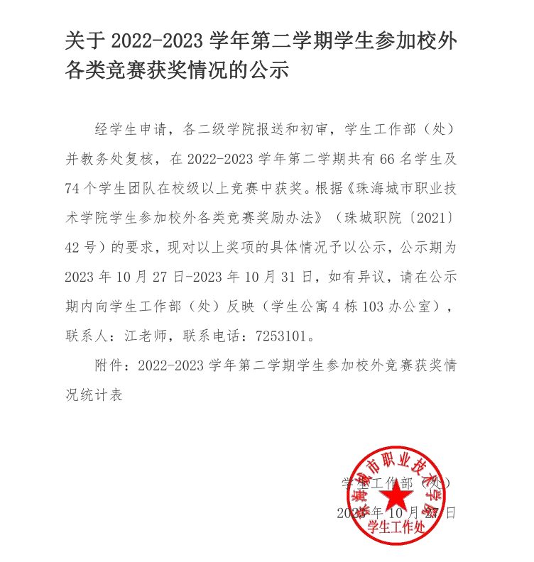 经学生申请,各二级学院报送和初审,学生工作部(处)并教务处复核,在2022-2023学年第二学期共有66名学生及74个学生团队在校级以上竞赛中获奖。根据《珠海城市职业技术学院学生参加校外各类竞赛奖励办法》(珠城职院〔2021〕42号)的要求,现对以上奖项的具体情况予以公示,公示期为2023年10月27日-2023年10月31日,如有异议,请在公示期内向学生工作部(处)反映(学生公寓4栋103办公室),联系人:江老师,联系电话:7253101。