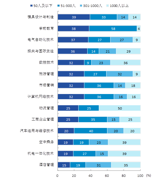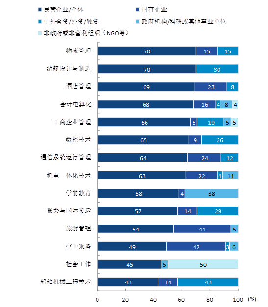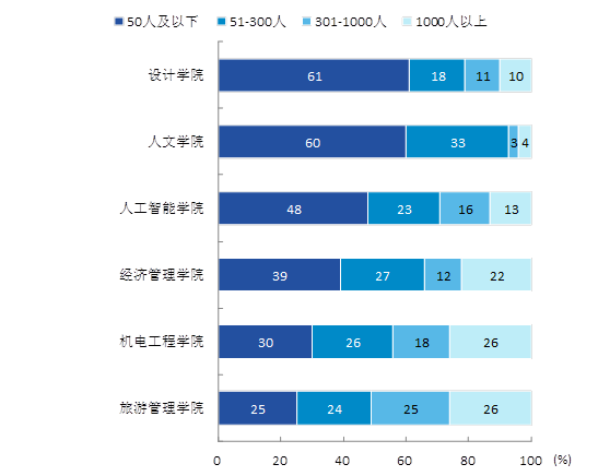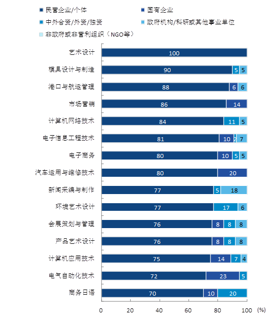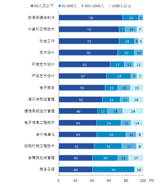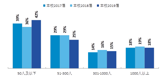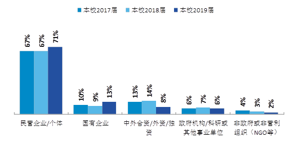 本校2019届毕业生主要就业的用人单位类型是民营企业/个体(71%),比本校2018届(67%)高4个百分点;毕业生主要就业于300人及以下规模的中小型用人单位(67%),略高于本校2018届(65%)。