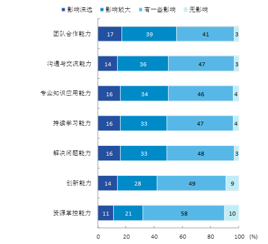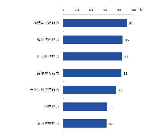 本校2019届毕业生认为工作中最重要的通用能力是“沟通与交流能力”(91%),其次是“解决问题能力”(85%)、“团队合作能力”(84%)、“持续学习能力”(83%)等。