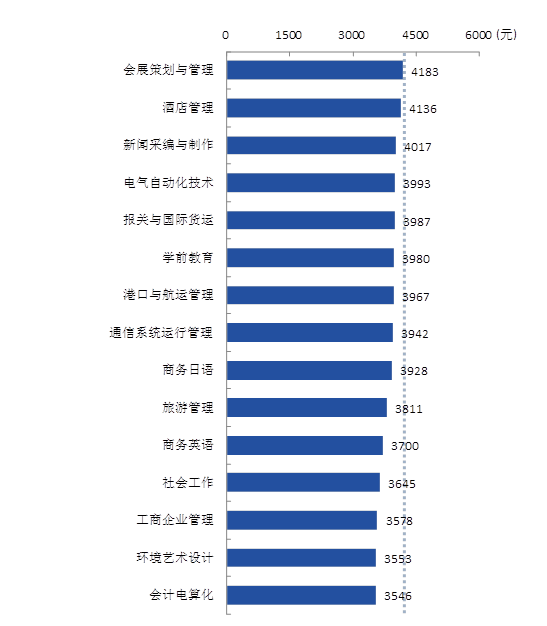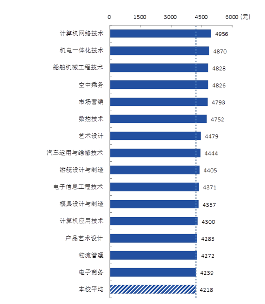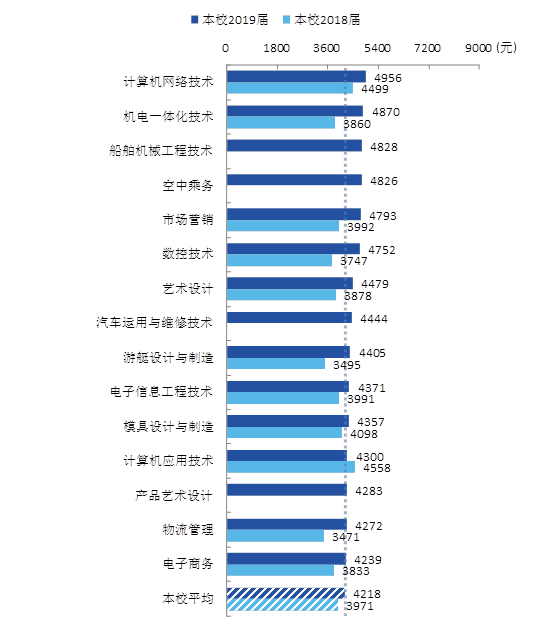 与本校2018届相比,本校2019届月收入上升较多的专业是机电一体化技术(4870元)、数控技术(4752元)、游艇设计与制造(4405元)、市场营销(4793元)、物流管理(4272元)。