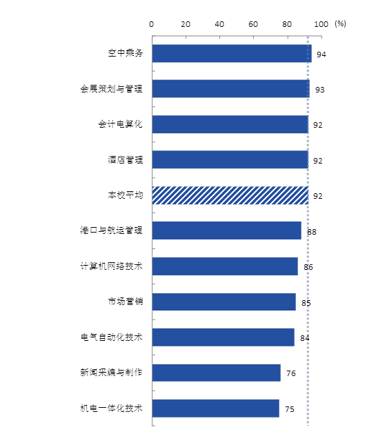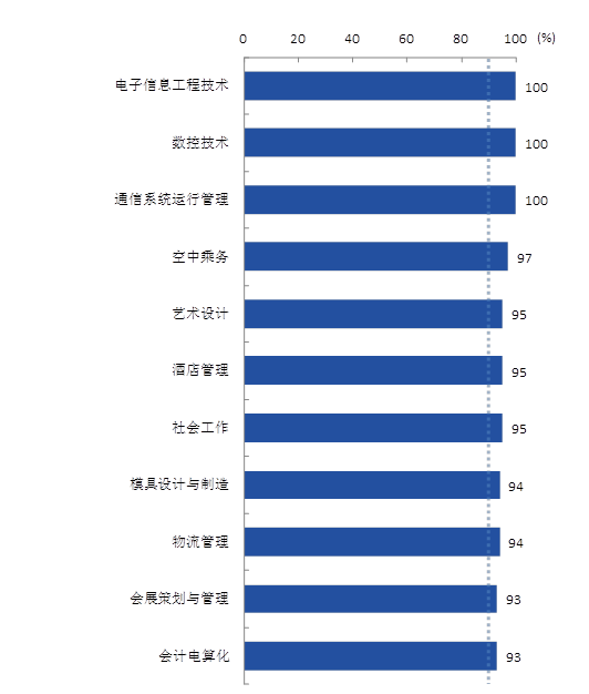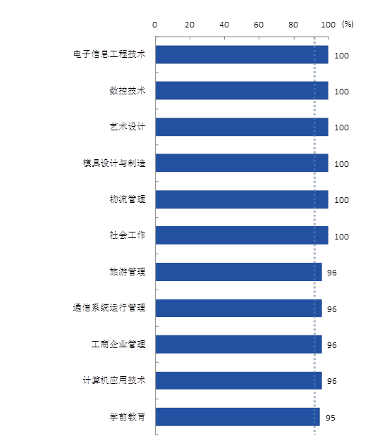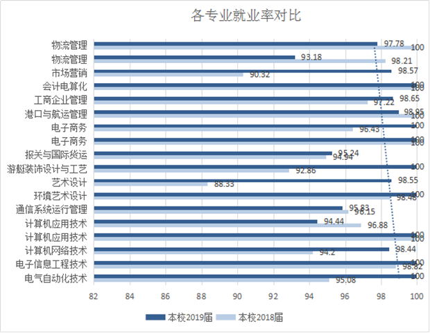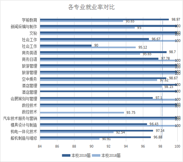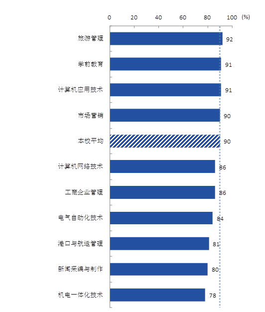 本校2019届毕业生教学满意度较高的专业是电子信息工程技术、数控技术、通信系统运行管理(均为100%),教学满意度较低的专业是机电一体化技术(78%)、新闻采编与制作(80%)、港口与航运管理(81%)。